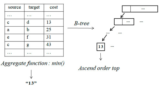 Most RDBMSs provide various indexing capabilities for tables. In a DBMS, a specific attribute value can be specified when creating an index. That is, an index for the d2s attribute can be created to find its minimum value. If the B-tree [21] index is created in descending order for the d2s attribute of the TAn table containing the visited nodes, the values are automatically stored in descending order. In other words, the smallest d2s value is placed in the leftmost node of an indexed tree. If they are assorted in ascending order and the top keyword is then returned (selection of the top tuple), the same minimum d2s value can be obtained without using an aggregate function. Figure 7 compares the two processes.