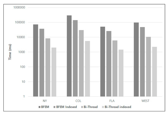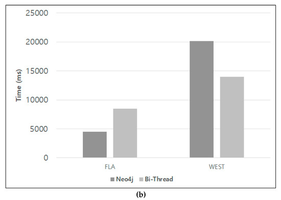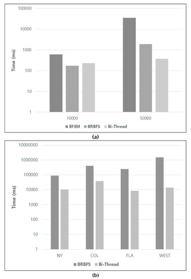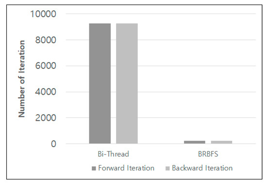 Figure 10 shows the average number of repeated FEM operations during the shortest path search for the WEST data in order to analyze the difference between BRBFS and Bi-Thread. As seen in the figure, the comparison of directions is relatively even for both techniques. Because the proposed method simultaneously performs forward and backward iterations and checks the results of the threads corresponding to the termination condition, the number of iterations increases; thus, increasing the throughput. This reduces the overall execution time.