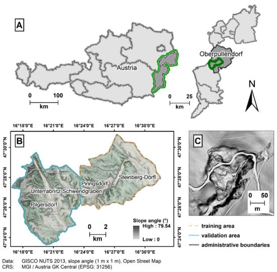 Overview of the study area: (A) Location in the district of Oberpullendorf and Austria; (B) study area split into training and validation areas; (C) example of a landslide visible in a slope map.