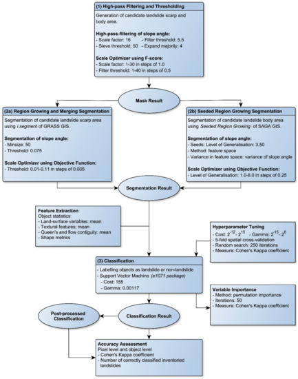 In this study, we examined the potential of open source software to conduct GEOBIA for landslide detection using solely HRDTM-derived variables. We combined land-surface variables, textural features, shape metrics and adjacencies to characterize and segment landslide parts, and subsequently identified landslide scarps and bodies using a support vector machine (SVM). Our study area was located in a landslide-prone area in Burgenland, Austria, where a HRDTM with a 1 × 1 m resolution was available. We mapped a historical landslide inventory (delineating the scarp and body) by visual interpretation of the LiDAR HRDTM. Since in GEOBIA, the segmentation and the classification techniques are subject to different optimization procedures, we used a rigorous statistical approach to select optimal segmentation scale parameters and classifier hyperparameters. The workflow was implemented in the free and open source programming environment R using the open source GIS (geographic information system) software for geodata processing. Sample data and code can be found in the Supplementary Materials.