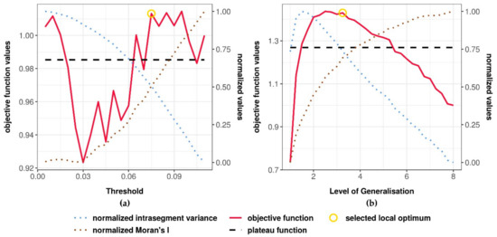Optimization results for ´segment´ step: (a) Objective function of GRASS GIS segmentations of candidate scarp area optimizing the scale parameter threshold; (b) objective function of SAGA GIS segmentations of candidate body area optimizing the scale parameter Level of Generalisation; note that the y-axis scales of the objective function plots (a, b) are different to make the figures easier to read.