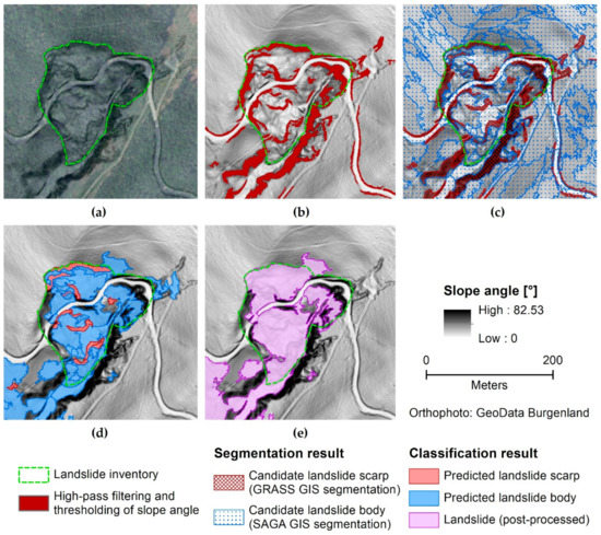 Results of the processing steps: (a) Landslide visible in a slope map; (b) ‘Mask’ step: Candidate landslide slope and body areas; (c) ‘Segment’ step: Segmentation result; (d) ‘Classify’ step: Predictions; (e) post-processed classification.