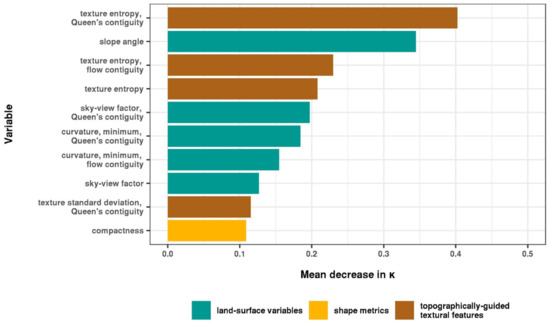 The three most important variables in detecting landslides using the SVM were texture entropy in Queen’s contiguity (κ decrease 0.40), slope angle (κ decrease 0.34), and texture entropy in flow contiguity (κ decrease 0.23). Generally, shape metrics had a lower importance; compactness as most important shape metric ranked 10th with a κ decrease of 0.11 (Figure 6, Table A2).