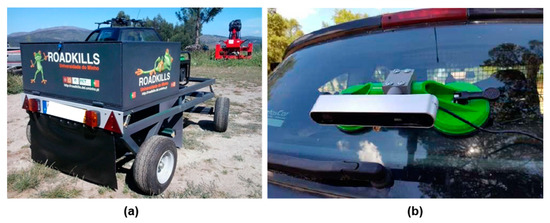 We recently developed a MMS to detect wildlife-vehicle collisions of amphibians, composed of a scanning system on a trailer [11,12]. The system included a trichromatic line scan camera, a light-emitting diode, a global positioning system (GPS) device, and an industrial computer. This system created a continuous road surface image, obtaining an object resolution of less than one millimeter [11]. Real surveys provided a correct classification rate of amphibians of 84% and a rate of failed classification of 16% [12]. One main advantage of this system is the possibility of checking the recorded images to find overlooked animals back at the office, something impossible to do in traditional surveys [6,7]. This system is ideal for passive surveys, which are more economical and less time-consuming [12]. Anyone with or without sampling skills can survey while travelling. However, the system has some limitations: the size and weight makes it cumbersome, the road sampling width is not large (the camera only captures one meter of the road width, not enough to cover an entire one-way road), the sampling length is limited to an external power source capacity (approximately one hour), and the total price of the system may be somewhat expensive (15,000 €) [11,12].