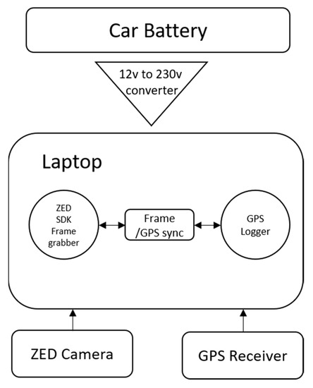 A diagram of the system architecture is presented in Figure 2. The system is controlled by several applications: mobile software to turn the device off and on, desktop software to collect and save images, desktop software to detect the WVCs in images, and software that continuously pin-points the device coordinates along the way.