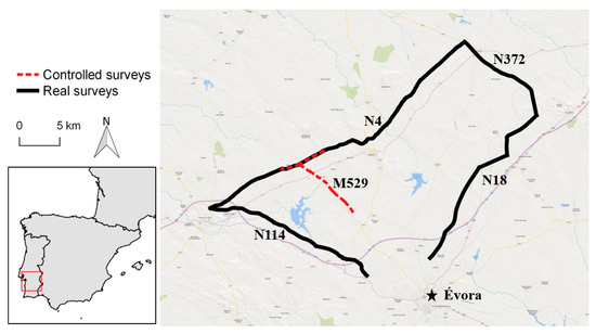 Finally, we performed several real surveys on national roads in Évora (Figure 3) with a total distance of 720 km for 12 days. The real surveys were always performed at a vehicle speed between 40 and 80 km/h. After our vehicle with the MMS2 travelled through the selected roads, a vehicle from the University of Évora wildlife-vehicle collisions monitoring program (LIFE LINES project [25]) repeated the same path to cross information.