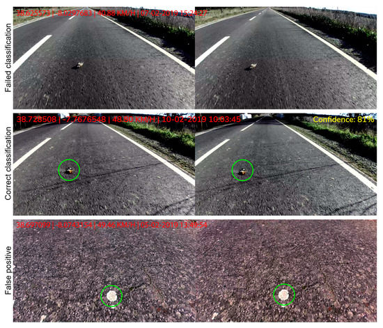 In all situations, we manually checked the images with WVCs (in real surveys, using the GPS coordinates collected by the University of Évora whenever they detected a WVC) and the ones the algorithm classified as WVCs. In each trial, we manually counted the number of frames with WVCs.