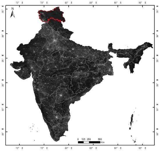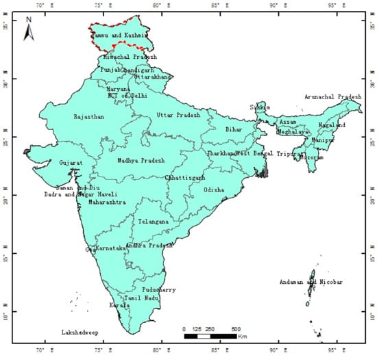 India is a country in South Asia, lying to the north of the equator between 6°44′ N and 35°30′ N and 68°7′ E and 97°25′ E. It is surrounded by the Indian Ocean, the Arabian Sea, and the Bay of Bengal. Since market-based economic reforms began in 1991, India has emerged as a global player with one of the fastest-growing major economies and is now considered a newly industrialized country []. It is also the world’s second-most populous country (with more than 1.3 billion people) as well as being the most populous democracy in the world. India is a federal republic governed under a parliamentary system and comprises 29 states and seven union territories, giving a total of 36 entities (as shown in Figure 1). It should be noted, however, that Jammu and Kashmir state, marked by the red dashed line, lies within the disputed Kashmir region.