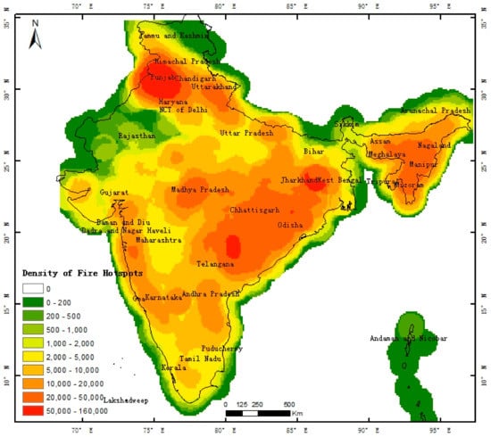 Spatial density of the 3,998,465 fire hotspots in Indian regions (including Jammu and Kashmir state).