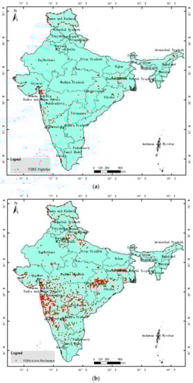 VIIRS Nightfire product (VNF), using Day/Night Band (DNB), near-infrared (M7 and M8), short-wave infrared (M10), and mid-wave infrared (M12 and M13) to detect subpixel heat sources, has been used in gas [] and industrial heat sources detection []. So, VNF data were downloaded from the Earth’s Observation Group (EOG) []. Their spatial distribution maps from VNF data and VNP14IMG data were made to compare in the study area (Figure 3) on 01/01/2018. It showed that VNP14IMG data were quite abundant in India. The fire/hotspot number of VNP14IMG was more tban five times than VNF. Its spatial distribution range was also bigger than the VNF data. So, VNP14IMG data were used lastly to detect heavy industries.