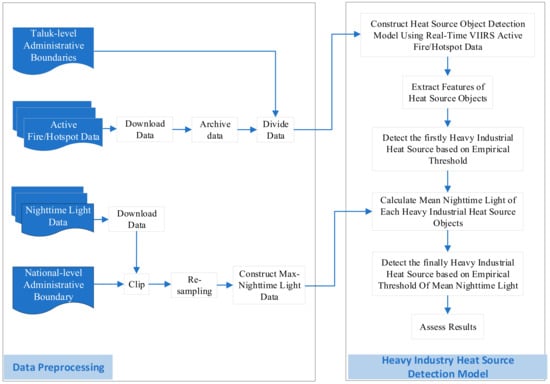 In this study, we propose an Indian heavy industry heat source detection model that uses VNP14IMG and NTL data. This model consists of six parts: constructing the heat source object detection model using real-time VNP14IMG data, extracting the hot features of the heat source objects, detecting the initial heavy industrial heat sources based on an empirical threshold, calculating the mean night-time light value for each heavy industrial heat source object, detecting the final heavy industrial heat sources based on the empirical threshold for the mean night-time light, and, finally, assessing the results. Details of the model are described in this section.