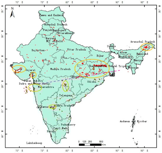 Satellite images, which can be considered to be objective, true data, have become the most effective way to monitor the dynamics of Land-Cover (LC) and Land-Use (LU) (also referred to as LULC) [,]. Heat sources, such as the combustion of fossil fuels in cement plants and steelworks and the flaring of petroleum gas in oil fields [,], are also vital for most heavy industries. Therefore, thermal anomaly products derived from remote sensing data provide new ways of revealing the objective and real-time distribution of heavy industry in India. Recently, it has been widely and well-used in the detection of global-scale self-ignition fire point data [,,,,]. Also, the night-time thermal anomaly product from the National Polar-orbiting Operational Environmental Satellite System (NPOESS) Preparatory Project (NPP) Visible Infrared Imaging Radiometer (VIIRS) has been successfully applied in studies of volcanic activity [] and oil exploitation []. NPP VIIRS night-time fire data (resolution 750 m) were used to identify industrial heat sources considering their time, space, and temperature information [,]. Also, better active global fire-points product named NPP VIIRS active fire product (VNP14IMG), with 375-m resolution and covering day- and night-time thermal anomaly, was provided by Schroeder et al. [] and Giglio et al. []. It effectively provided an improved response for fires with small areas. Then, Ma et al. [] proposed a heavy industry heat source detection model based on an improved adaptive K-means algorithm using long-term VNP14IMG data. This produced good results for mainland China; however, due to the complexity of the Indian geographical coverage, the precision was not so good when this was applied to India.