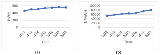- The total NWH and NFHWH values for India increased throughout the period studied, especially in the case of the NFHWH. These trends were similar to those for the GDP and total population of India (Figure 7) between 2012 and 2017.