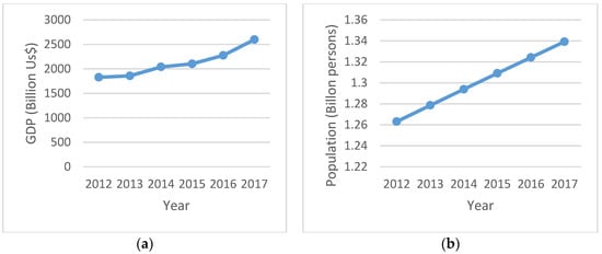Recent changes in working heavy industry heat sources were compared, and the values of the NWH and NFHWH for each year during the period 2012 to 2018 were calculated (Figure 7). The values of NWH, and in particular, the NFHWH increased during this period. The trends in GDP and total population in India (Figure 8) between 2012 and 2017 were similar [], demonstrating that heavy industries developed along with the development of the Indian economy as a whole.