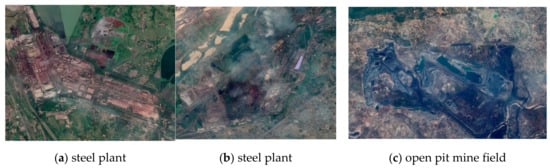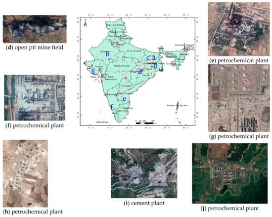 High-resolution images from Google Earth (Figure 9) were selected to verify the results of the model. Figure 9a,b are images of steel plants in Jharkhand and West Bengal. The two open-pit minefields shown in Figure 9c,d are located in Jharkhand and Chhattisgarh. Figure 9e–h,j all show facilities related to oil and gas production, processing, and storage in Andhra Pradesh, Gujarat, Rajasthan and Assam, respectively. Figure 9i is an image of cement work named Gagal in Himachal Pradesh.