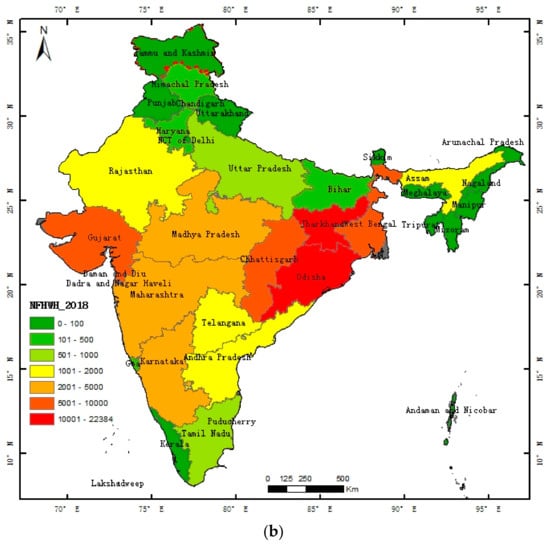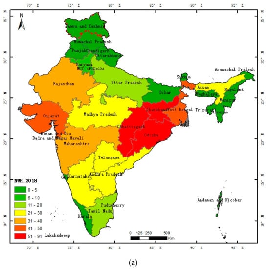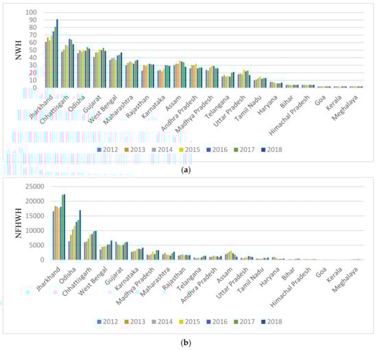 Figure 10a shows the NWH for the states with the 20 highest values. These included Jharkhand, Chhattisgarh, and Odisha, followed by Gujarat and West Bengal. Furthermore, the NWH in Jharkhand state accounted for nearly 13.8% of the total for Indian mainland sources. The sum of the NWH in Jharkhand, Chhattisgarh, Odisha, and Gujarat accounted for 43.38% of the total; the total NWH for the top 20 states accounted for 98.37%. In addition, the NWH for Jharkhand, which is one of the richest mineral zones in the world and boasts 40% and 29% of India’s mineral and coal reserves, respectively, increased continuously during the period 2012 to 2018 []. Chhattisgarh’s heavy industry also developed due to its rich natural resources, policy incentives, and good infrastructure [].