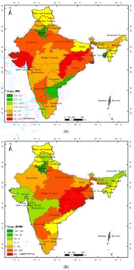 The distributions of and values were mapped to illustrate the changing trends for each statistical area during the seven-year period studied (Figure 11). The largest positive value of was in Jharkhand, followed by Chhattisgarh and Gujarat, indicating that the number of heavy industry heat sources in these three states increased quickly. The smallest negative value was found in Haryana, followed by Tripura and Andhra Pradesh. However, these negative values were all very small −0.49, −0.23, and −0.14, respectively. This means that the downward trends here were very slow. In addition, for 18 of the large states in mainland India, the values were positive and only four states had negative values. Therefore, it can be concluded that the total number of heavy industry heat sources in India increased, as confirmed by Figure 7.