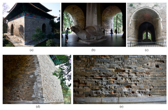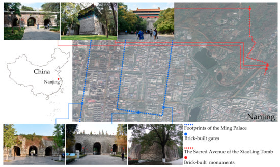The Ming Dynasty (1368–1644 AD) witnessed the rise of brick structures in China. The Great Wall was extensively strengthened and rebuilt during this period for the third time in history [1], and most of the ruins observed today originated during this period. As the capital of the Ming empire before 1421 AD, Nanjing retains abundant brick-built ruins, including royal tombs, temples, civil infrastructures and city walls (Figure 1).