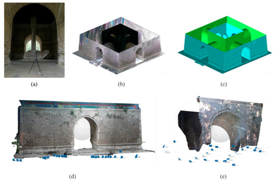 Optical measurements conducted on the Stele Tower. (a) TLS using a Leica BLK360; (b) point cloud derived from TLS; (c) mesh generated from surface reconstruction; (d,e) Textured mesh of (d) the east façade and (e) the west vault derived using photogrammetry.