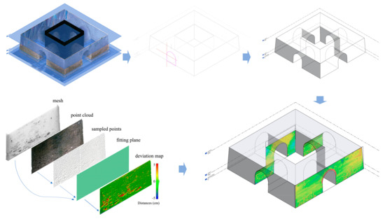 The as-built raster imageries included orthoimages, generated with photogrammetry, and relief maps showing the depth information of brick surfaces such as holes and missing blocks. The relief map of each segment of a wall and a vault was colored according to the distances between the TLS-derived point cloud and its fitting plane. The latter was defined by interpolating the subsamples of each segment. The distances between the fitting plane and point cloud were computed using signed distances. The relief maps (.png format) were attached to the corresponding surfaces (via “decal” in Revit) along with orthoimages to provide intuitive as-built conditions and clues for annotations.