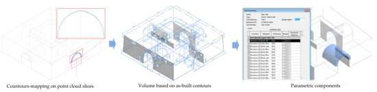 The host model represented an ideal form (as-designed) without considering the as-built geometry. It was considered symmetrically composed of basic elements such as straight lines and semicircles. The point cloud was used to accommodate contours for 3D modeling, but the slight asymmetries and deformations of the as-built condition were neglected. The volume of the Stele Tower was generated by blending two rectangular contours at the ground floor level and top level. Four vaulted doorways were spanned using four void volumes to penetrate the solid volume. The above operations were created as a “mass” through “in-place component” in Revit.