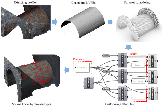 Building information modeling (BIM) is a component-based modeling environment that is semantically structured [26]. Even though BIM was developed for the architecture, engineering and construction (AEC) industry, historic BIM (HBIM) attracted research interest from the field of built heritage. It is considered a potential platform to bridge the gap between advanced measurements and various conservation-oriented applications [27,28]. As-built BIM refers to a BIM representation of the “as-is” state of built heritage at the time of a survey [29]. It is oriented toward representing the damages, decays, missing parts and other imperfect conditions using advanced measurement technologies. As BIM is not inherently oriented toward modeling and managing as-built data, fundamental issues should be addressed with the characteristics of historic brick structures.