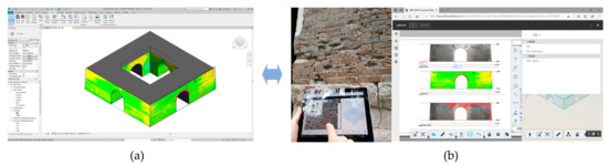 The components were subdivided using “parts” in Revit. This enabled the brickwork laid at different times to be distinguished manually and provided elevations, sections, and isometric views at a fine scale (1:50) (Figure 8c). However, the cost of subdividing components was the loss of the semantic data that were attached to components in Revit. The transition between components and subdivided parts is reversible; they can be switched for an HR survey with different concentrations.