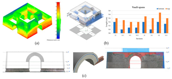 As-built dimensions and deformation analysis were produced from LoD 2 owing to its high accuracy. The mean deviation and standard deviation between the LoD 2 model and TLS-derived mesh (mean error of 3 mm) were 1.6 and 1.2 cm, respectively (Figure 8a). Given the length of the Stele Tower (25.7 m), the relative error was 1/1600 (=1.6 cm/25.7 m). This accuracy considered the severe weathering of brick on exposed surfaces: the point-cloud contours were mapped without including such details. The as-built 3D model improved the accuracy of drawing production and dimension extraction. The sections that passed through the vaults reflected the actual dimensions of construction details (brick courses and mortar). Convenient dimension extraction facilitated the statistical analysis of structural deformation, such as the deformation of the barrel vaults caused by lateral thrusts. The results showed that all barrel vaults experienced this problem. The largest deformation was located at the outer section of the south vault, which was 6 cm longer on the higher level (top) compared to the lower level (bottom) (Figure 8b).