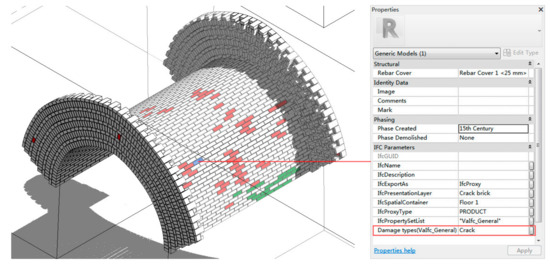 The generated 3D models of brick units were enriched with a parameter using the VisualARQ plugin of Grasshopper. “Damage types” consists of two values (“Crack” and “Impact damage”) based on preliminary observations by the naked eye. The generated brick-unit models were manually grouped to be assigned with the corresponding values and stored in IFC 2 × 3 format for subsequent use in Revit.