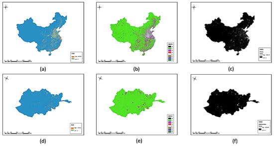 (a) NTL for mainland China, (b) GHS SMOD data for mainland China, (c) GHS population data for mainland China, (d) NTL for Afghanistan, (e) GHS SMOD data for Afghanistan, (f) GHS population data for Afghanistan.