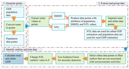 Results from previous studies show that using NTL alone is insufficient to accurately measure the GDP at subnational levels [27]. In order to assess the different levels of socioeconomic development in the country, we separated the data into urban and rural data to capture the different levels of industrial, commercial, and agricultural activities on a subnational scale using level 0, 1, and 2 administrative districts from GADM. The data preparation consisted of three steps (Figure 2). In step 1, we converted GHS population raster data to points in ArcGIS Pro 2.4.1 and used the converted population data points to sample and extract the values of human settlement information and NTL intensity values based on SMOD data and VIIRS NTL. Therefore, all data points contained attribute information of population, nighttime light value, SMOD, administrative districts information at different levels, income classification (based on country), and unique point identifier. In step 2, we separated population data into urban and rural data based on the SMOD value. In step 3, we applied the iForest method to identify NTL outliers in urban regions that were not related to socioeconomic activities and reclassified them as 0.