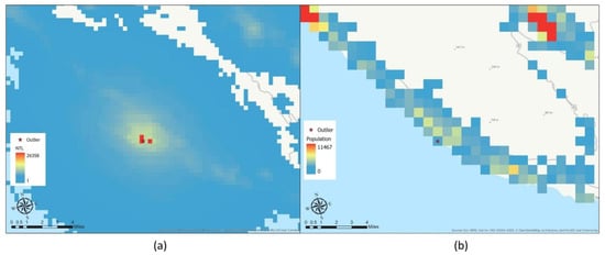 Although we selected the “vcm-orm-ntl”, irrelevant light sources that are not filtered by the product processing algorithm still remain due to its sensitivity [28]. Moreover, NTL is not directly measuring socioeconomic activities and contains irrelevant data that can greatly affect the GDP estimates especially at the 1 km2 level [38,39]. Therefore, we adopted a series of measures to remove these irrelevant data in step 3. Since we were only using NTL to measure GDP in the urban regions, we first filtered the data by selecting the data points in the urban regions based on their attributes (SMOD value >20). Then, we used the unsupervised machine learning model of iForest to detect the anomalies for the urban pixels based on the population and NTL attributes of urban data points. Over the past decades, many anomaly detection models have been developed based on classification, clustering, and statistical methods. Some researchers have used the DMSP data as a mask to extract the VIIRS data or build a normal profile for the NTL data in order to remove outliers based on the range of NTL intensity value distribution. However, it is very difficult to apply this method globally due to the variations among countries. Furthermore, some of the methods can only be applied to data of low dimensionality and smaller size. By contrast, the iForest machine learning model can automatically detect irrelevant NTL outliers [30] because it is (1) not reliant on the distribution profile of NTL data, (2) more suitable for processing large datasets, and (3) specifically designed to detect anomalies. Studies have demonstrated that the iForest method can outperform many other existing model-based, distance-based, and density-based methods [30]. It is also more suitable for processing large datasets compared to traditional methods like the density-based spatial clustering of applications with noise (DBSCAN) [40]. We used data points for all countries as input so that iForest could detect outliers based on the population and NTL values’ patterns. For instance, points with extremely high NTL value and low population were identified as anomalies (Figure 3). The identified NTL outlier values were changed to 0. Since we had already used a filtered VIIRS NTL product, only a small proportion (about 0.1%) of NTL outliers were detected.