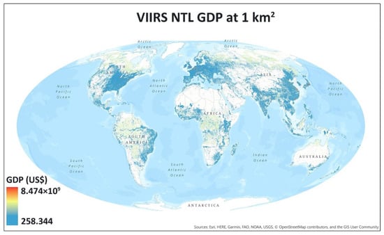 where i is the unique identification of population pixel (derived from the GHS population layer), SnNTL is the total NTL in the district, TotNTL is the total NTL for the country, PopVi is the population count of the corresponding pixel, TotRuPop and TotUrPop are the total rural and urban population for the country, AgRatio is the proportion of agriculture production of the total GDP, and GDP is the national GDP at purchasing power parity (in 2011 constant U.S. dollars) data obtained from the World Bank database. Based on the procedures described above, we produced a gridded GDP product at the 1 km2 level for countries around the world (Figure 4). The subnational GDP calculation was based on the aggregate NTL and population using level 2 GADM districts. In addition, for countries without AgRatio data, we used the total rural population divided by the total national population to calculate the estimated AgRatio.
