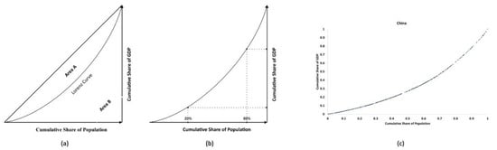 Lorenz curve for Gini and 20:20 ratios estimation. Calculation of (a) NTL-Gini and (b) NTL-2020 ratios based on the Lorenz curve, and (c) sample Lorenz curve for China based on the cumulative distribution of population and GDP.