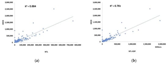 (a) Scatterplot of Organisation for Economic Co-operation and Development (OECD) regional GDP and sum of NTL values within districts, and (b) scatterplot of OECD regional GDP and district-level NTL GDP (n = 246 subnational districts).