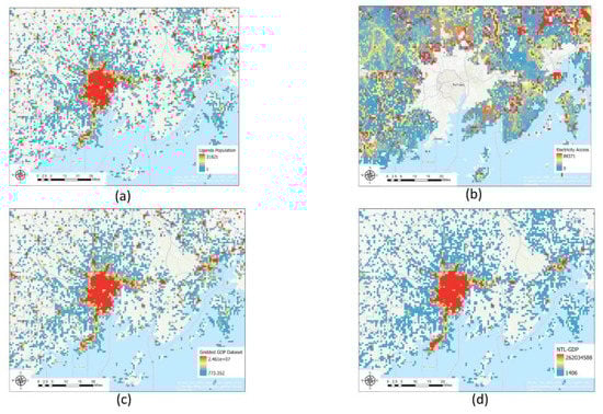 Comparisons of population distribution, electricity accessibility [47], Gridded GDP at the 1 km2 level [48], and NTL GDP data around Kampala, Uganda. (a) Population data, (b) electricity access data, (c) GDP data from Gridded global datasets, (d) NTL-based GDP.