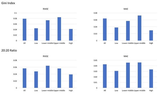Validation of NTL-based Gini coefficient and 20:20 ratios based on root mean square error (RMSE) and mean absolute error (MAE) for all countries, low-income countries, lower-middle income countries, upper-middle income countries, and high-income countries.