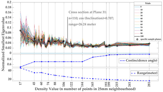 As shown in Figure 1, density varies inherently with changes of range and incidence angle in the simulated planes—as range and incidence angle increase, density decreases. Accordingly, the number of points, , encapsulated in the applied fixed range search of 2.5 cm across the entire PCs, is an indicator of density variation among diversely oriented planes. Therefore, each simulated plane corresponds to an value indicating a specific density.
