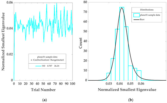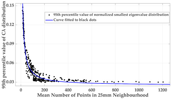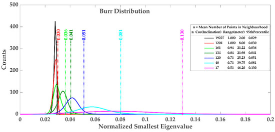 Figure 4 shows Burr pdfs fit to the deviations of over different trials for each plane orientation simulating various densities. According to Edelman [60,61], the distribution of the smallest eigenvalues gets wider as gets smaller, which agrees with Figure 4. This is rational, since the smaller number of points in the fixed range search, , indicates lower density which is less tolerant to the noise resulting in higher uncertainty of . In other words, the defined threshold value automatically quantifies the impact of point density variations in the applied fixed range search.
