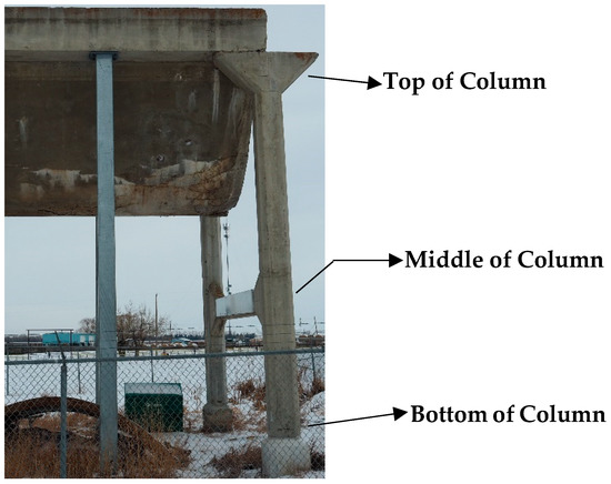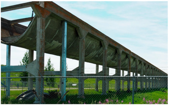 The feasibility of the proposed damage assessment algorithm has been evaluated on data collected from a cultural heritage structure, an aqueduct site in Brooks, Alberta, Canada. The Brooks aqueduct (Figure 6), commissioned in 1914, is located in a shallow valley 5 km southeast of Brooks. The aqueduct is an impressive reinforced concrete structure over 3.1 km in length featuring a large catenary-shaped flume mounted on 20 m high columns [64].