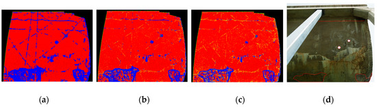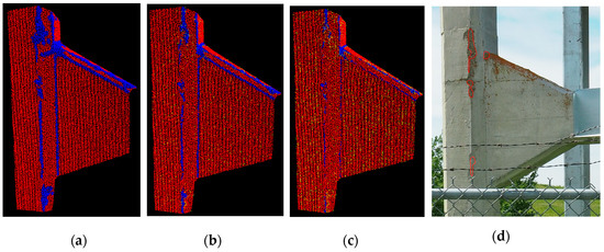 The input to the algorithm is the TLS PC Cartesian coordinates of the surface of the structure. Local surface variation, , at a fixed range search defined according to the size of smallest damage was selected as a distinguishing and defect-sensitive feature. Robust PCA was used to compute a robust estimate of . The numerical simulations led to the definition of a function to compute a systematic threshold as a function of the number of points encapsulated in the applied fixed range search neighborhood. Accordingly, each 3D point was assigned a semantic label determining whether it is damage or not and visualized in an output scan map. Classification results were validated by comparing manually-delineated damage areas on different perspectives of the available imagery of concrete surface with the relative position of the corresponding defective areas shown on the output map. To validate this method, a synergistic application of different NDT techniques is needed in order to verify the deeper location of damaged parts of the concrete.