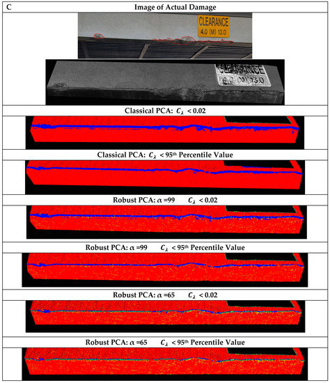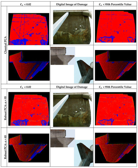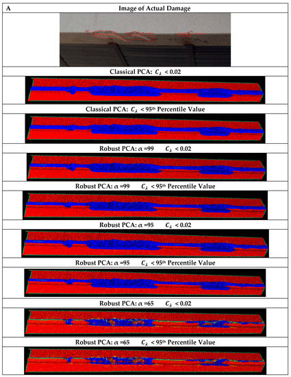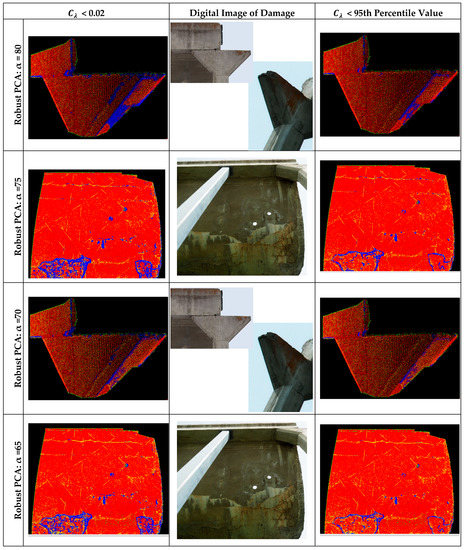 Santos et al. [44] demonstrated that Kernel PCA (KPCA) can reveal more complicated hidden structures of the data than linear PCA and can enhance separation of damaged from undamaged conditions in acceleration time-series data captured of an aluminum frame structure in laboratory conditions. The KPCA algorithm is an extension of the linear PCA that maps data into a high-dimensional space to model nonlinear patterns presented in the original observation space and provide better classification performance [45]. Although, KPCA—similarly to kernel-based learning methods such as support vector machines—can handle the nonlinear relationship between features and class labels, its performance depends on the choice of kernel function and kernel parameters. Cross-validation, the most commonly used method to obtain these optimal kernel variables, is time consuming for massive data sets such as PCs applied in this study [44,46]. This research will demonstrate how a robust version of the linear PCA can improve shallow surface damage classification of PCs by masking changes caused by data artefacts from changes caused by damage.