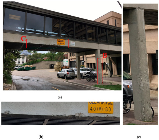 (a) North side of the on-campus pedestrian overpass with visible damage at rectangle areas B and C; (b) correspond to larger zoom of C in (a); (c) correspond to larger zoom of B in (a).