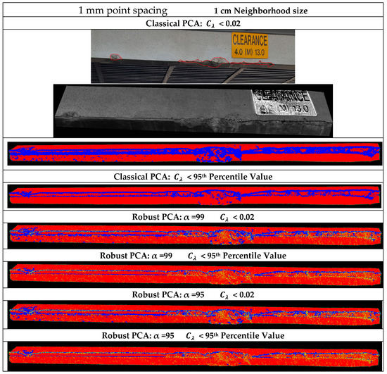 As shown in Figure 22, at 1 mm point spacing and neighborhood size 1 cm, both the systematic threshold and the subjective threshold are able to detect the superficial damaged areas. However, the problem is that some damaged points are erroneously flagged as outliers even at the very large inlier percentage of α = 99. This can be justified that the very small neighborhood of 1 cm is not sufficiently large to average out effects of noise and thus robust PCA becomes highly sensitive to noise.