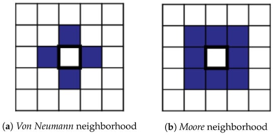 Cell neighborhood is defined as the nearest cells to a specific one. Only cells in the neighborhood are used to evaluate the metrics above. There are two possible concepts of “cell neighborhood” (CN): the von Neumann definition, which considers the four adjacent cells in the cardinal directions, and the Moore one, which considers both the corners and edges of adjacent cells (Figure 2). While von Neumann neighborhood considers 4 cells, Moore neighborhood uses 8 cells for the calculations.