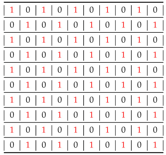 The fist map is configured as a chessboard (Figure 3), alternating cells with value 1 and 0. Since each pixel of value 1 represents a separate patch, the total number of patches (NP) is 5000, the patch density (PD), which is maximum for this configuration, is equal to 10,000 (number of patches/100 ha), the (uniform) mean patch size (MPS) is 0.01 (ha), the edge density (ED) is 4000 (m/ha), and the landscape shape index (LSI) is 70.71. This configuration is the one that maximizes the difference of outcomes for the different choices of CN values.