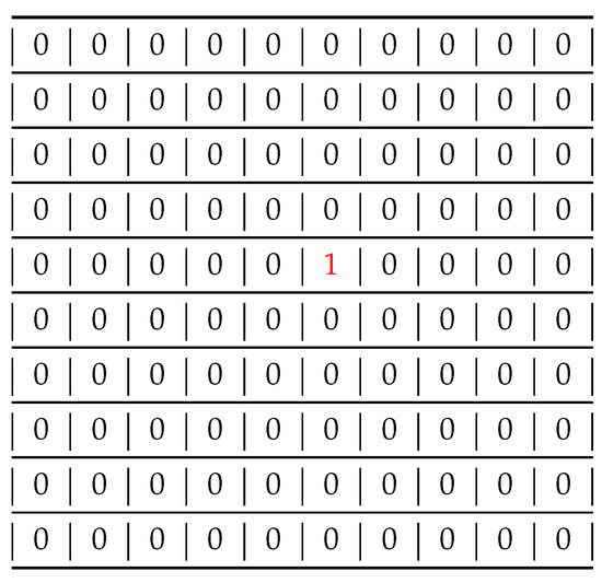 The fourth test map (Figure 6) contains a single patch consisting of just one pixel at the center of the map. For this map the total number of patches (NP) is 1, the patch density (PD) is 10,000 (number of patches/100 ha), the mean patch size (MPS) is 0.01 (ha), the edge density (ED) is 4000 (m/ha) and the landscape shape index (LSI) is 1.