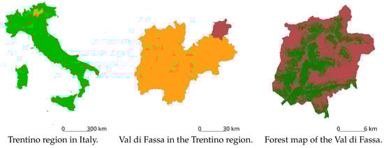- Gobbi, S.; Cantiani, M.G.; Rocchini, D.; Zatelli, P.; Tattoni, C.; Ciolli, M.; La Porta, N. Fine spatial scale modelling of Trentino past forest landscape (Trentinoland): A case study of FOSS application. In Proceedings of the International Archives of the Photogrammetry, Remote Sensing and Spatial Information Sciences—ISPRS Archives, Bucharest, Romania, 26–30 August 2019; Volume XLII-4/W14, pp. 71–78. [Google Scholar] [CrossRef]