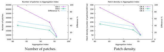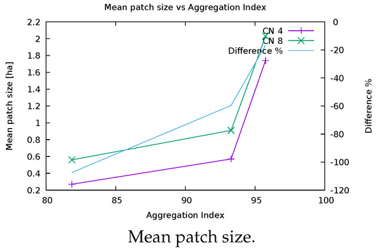 The value of the cell neighborhood parameter was specified in eight different papers: seven chose a Moore definition [13,14,15,16,17,18,19,20] and one a von Neumann definition [21]. The 16 papers which exclusively employed LecoS [22,23,24,25,26,27,28,29,30,31,32,33,34,35,36,37] used an 8-cells neighborhood rule, as it is the only setting available in the add-on; a similar hypothesis is applicable to the four works which used r.li in GRASS [38,39,40,41], which uses a 4-cells neighborhood definition. The papers which did not specify the definition of the neighborhood in FRAGSTATS are assumed to have used a 8-cells definition, since this is the default setting [42], although it is not possible to prove this assumption. Results in Section 4 demonstrate that some of the most commonly used metrics are affected by the choice of this parameter. Therefore, the fact that the cell neighborhood configuration is not explicitly or implicitly specified in most of the research papers analyzed (by the indication of the software used) could make the results difficult to repeat and interpret.
