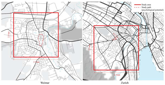 Case study areas in two cities—Weimar, Germany and Zürich, Switzerland. Both case studies comprise 6.25 km2 and contain the path used to study psychological potential of urban form. (Data source: OpenStreetMaps.org and Mapbox.com).